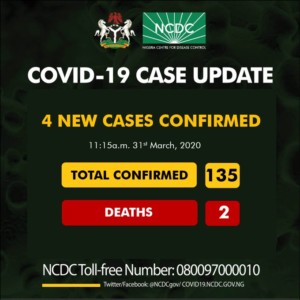 “As at 11:15 am 31st March there are 135 confirmed cases of #COVID19 reported in Nigeria with 2 deaths”.