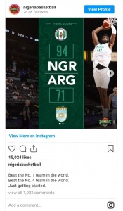 Nigeria defeated Argentina 95-71 on Monday, July 13 at the Michelob Ultra Arena in Las Vegas, as part of their Olympic preparations. Nigeria was led by Jahlil Okafor (15 points), Josh Okogie (10 points), and Chimezie Metu (10 points).
