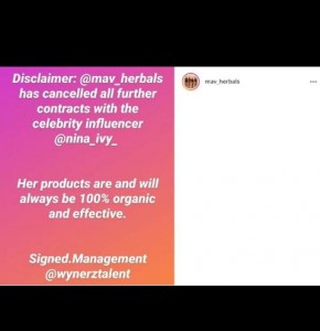 “Disclaimer: @mav_herbals has canceled all further contacts with the celebrity influencer @nina_ivy_. Her products are and will always be 100% organic and effective. Signed management @wynerztalent”.