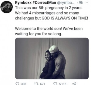 ”This was our 5th pregnancy in 2 years. We had 4 miscarriages and so many challenges but GOD IS ALWAYS ON TIME!