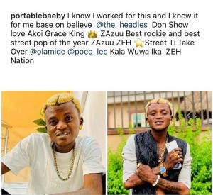 “The Headies don show love . Akoi Grace King. ZAzuu Best rookie and best street pop of the year. ZAzuu ZEH. Street ti Take Over @olamide @poco_lee Kala Wuwa Ika ZEH Nation.”
