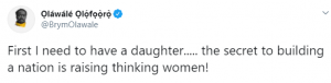 ”First I need to have a daughter….. the secret to building a nation is raising thinking women!” he tweeted