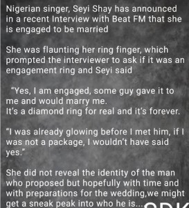 Nigerian Singer and songwriter, Deborah Oluwaseyi Joshua popularly known as Seyi Shay, revealed that she is engaged and set to get married.