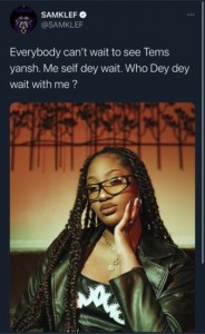 “Everybody can’t wait to see Tems yansh. Me self dey wait. Who dey wait with me?”