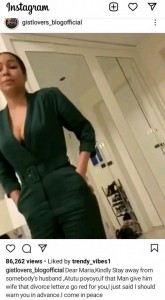 According to the blogger, if the man she’s following gives those divorce papers he’s been planning to give his wife because of her to the wife then she should know that it’s going to be red for her on the gram as all her secrets will be coming out without her consent.