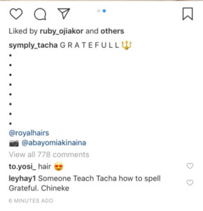 A man on social media platform, Instagram has roasted Tacha of the Big Brother Naija ‘Pepper Dem’ show for making a minor blunder on her birthday after she spelt ‘Grateful’ as ‘Gratefull’ in her post.