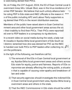 The petition, dated 24th August 2024, specifically accuses certain EOs of colluding with leaders of the ruling People’s Democratic Party (PDP) in Edo State. According to TESA, these compromised officers have allegedly been meeting with PDP leaders, resulting in the denial of Permanent Voter Cards (PVCs) to members of the public, particularly those supporting opposition parties like the All Progressives Congress (APC) and Labour Party.