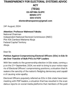 With the gubernatorial election in Edo State just weeks away, the Transparency for Electoral Systems Advocacy (TESA) has raised serious concerns about the integrity of the upcoming election. In a formal petition addressed to Professor Mahmood Yakubu, the National Chairman of the Independent National Electoral Commission (INEC), TESA has highlighted alarming reports of compromised behavior by Electoral Officers (EOs) in Edo State, which it claims threatens the fairness and credibility of the electoral process.