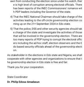 3. Withdrawal of the current INEC Commissioner in Edo State from overseeing the election, due to his alleged close ties with PDP leaders and the high level of corruption under his watch.