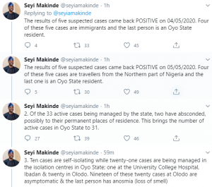 ”Of the 33 active cases being managed by the state, two have absconded, possibly to their permanent places of residence. This brings the number of active cases in Oyo State to 31.” he tweeted