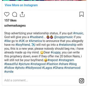 He wrote: Stop advertising your relationship status, if you quit #music, God will give you a #husband… ♀♀ @cuppymusic if you #like go to #UK or #America to announce that you allegedly have no #boyfriend, ✈i will not go into a #relationship with you, this is a new year, please nobody should beg me, I have already made up my mind. Dear #cuppy, you can write this prophecy down, even if they offer me 20 billion Naira, I will still not be your boyfriend.”