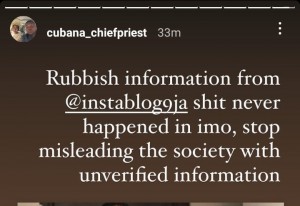 Taking to his Instastory on Sunday morning, he wrote: “Rubbish information from @instabloggja shit never happened in imo, stop misleading the society with unverified information.”