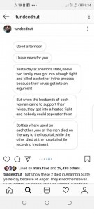 According to reports, the fight that ended in a stalemate saw the two men lose their lives. It all started when two wives began arguing and one called the other stupid, saying it is the reason her husband beats her every now and then.