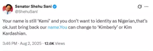 Reacting to her comments, Sani asked her to go ahead and effect a name change as she no longer identifies as Nigerian.
