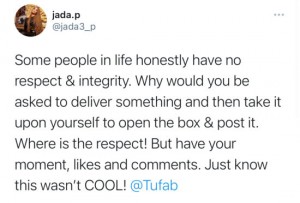 “Some people in life honestly have no respect & integrity. Why would you be asked to deliver something and then take it upon yourself to open the box & post it. Where is the respect! But have your moment, likes and comments. Just know this wasn’t COOL! @Tufab.”