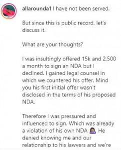 “I was insultingly offered 15k and 2,500 a month to sign an NDA but I declined. I gained legal counsel in which we countered his offer. Mind you his first initial offer wasn’t disclosed in the terms of his proposed NDA.”. She said