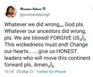 Ghanaian actress, Yvonne Nelson, this afternoon via her Twitter handle, took the African continent to God in prayers.