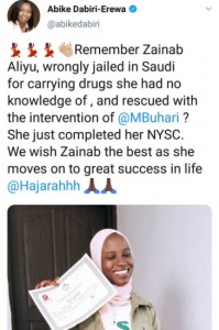 Dabiri-Erewa shared a picture showing Zainab flaunting her NYSC certificate and wrote: “Remember Zainab Aliyu, wrongly jailed in Saudi for carrying drugs she had no knowledge of, and rescued with the intervention of ?@MBuhari? She just completed her NYSC. We wish Zainab the best as she moves on to great success in life ?@Hajarahhh”, she tweeted.